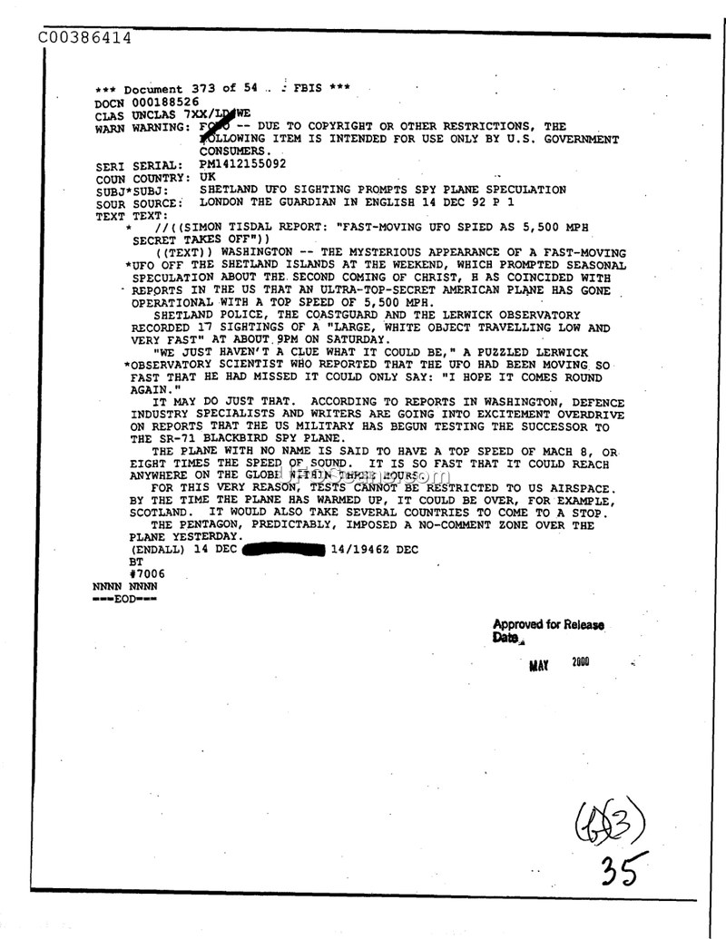 This FBIS report details 17 sightings of a high-speed object over the Shetland Islands in December 1992. The sightings led to public and media speculation regarding a secret U.S. military aircraft successor to the SR-71 Blackbird.