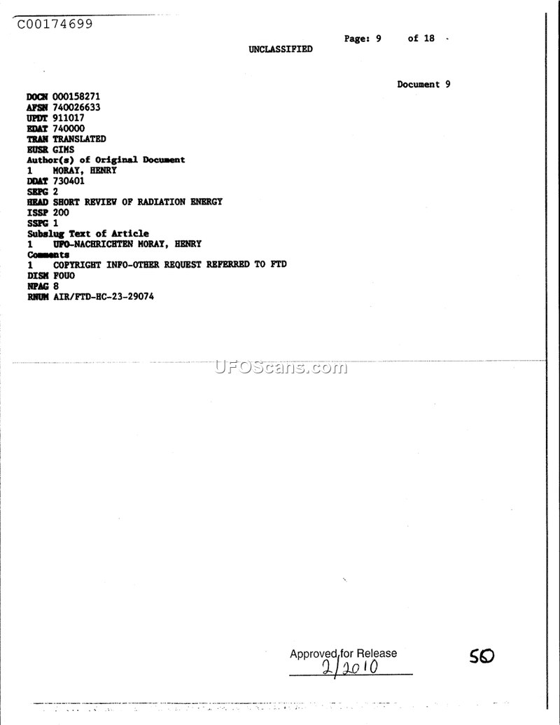 This document serves as a bibliographic or reference record for a document titled 'SHORT REVIEW OF RADIATION ENERGY' authored by Henry Moray. The document is dated April 1, 1973, and is associated with the reference number AIR/FTD-HC-23-29074. It notes that the content is related to 'UFO-NACHRICHTEN MORAY, HENRY'. The record indicates that a request for the copyright information was referred to the Foreign Technology Division (FTD). The document is marked as unclassified and was approved for release in February 2010.