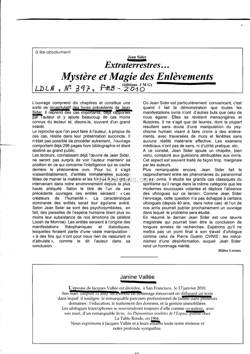 This document, published in the February 2010 issue of LDLN (No. 397), features two distinct sections. The first is a review by Didier Leroux of Jean Sider's work, 'Extraterrestres... Mystère et Magie des Enlèvements'. Leroux characterizes Sider's book as a significant contribution that argues against the physical reality of abduction phenomena. According to the review, Sider posits that these events are psychological manipulations designed to deceive, rather than genuine extraterrestrial encounters. Sider suggests that the entities involved are 'psychosymbionts'—parasites feeding on human emotions—and that the entire phenomenon is part of a broader, deceptive manipulation. Leroux praises Sider's analytical approach, noting that he effectively links these modern abduction reports to historical spiritualist traditions. The second section of the document is a brief obituary for Janine Vallée, the wife of Jacques Vallée, who passed away in San Francisco on January 17, 2010. The notice highlights her professional background in data processing and real estate, and acknowledges her role as a co-author with her husband on the 1966 work, 'Phénomènes insolites de l'Espace'.