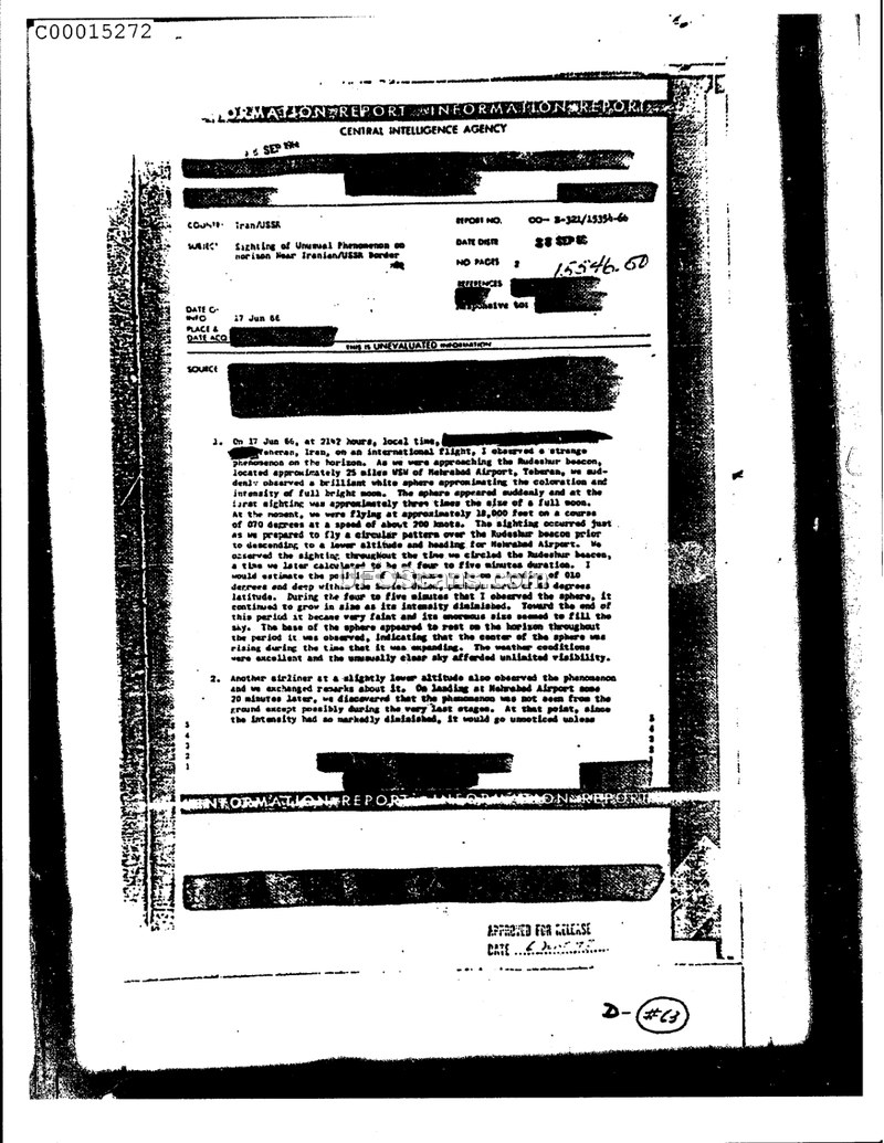 An airline pilot reported observing a large, brilliant white sphere near the Iranian/USSR border on June 17, 1966. The phenomenon lasted several minutes and was also witnessed by another airliner.