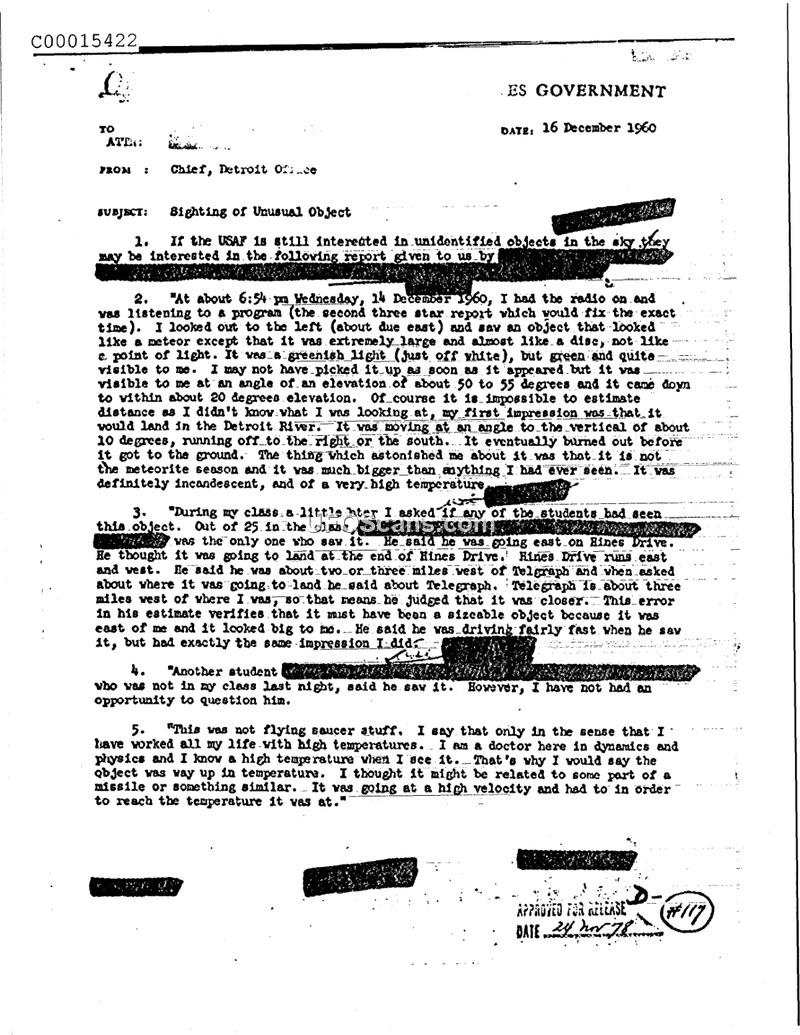 This document is a report from the Detroit Office of the U.S. Government, dated December 16, 1960, regarding a sighting of an unusual object. The report details an incident that occurred on the evening of December 14, 1960, at approximately 6:54 p.m. The primary witness, identified as a doctor in dynamics and physics, observed an object that appeared to be a greenish, off-white light, described as being 'almost like a disc.' The witness noted that the object was incandescent and appeared to be at a very high temperature. It was observed at an elevation of 50 to 55 degrees and descended to approximately 20 degrees before burning out. The witness, drawing upon his professional background, speculated that the object might be related to a missile or similar technology due to its high velocity and temperature. The report also mentions that a student in the witness's class claimed to have seen the object while driving east on Hines Drive, near Telegraph Road, and corroborated the witness's impression of the object's size and speed. A second student was also mentioned as having seen the object, though they had not yet been interviewed at the time of the report.