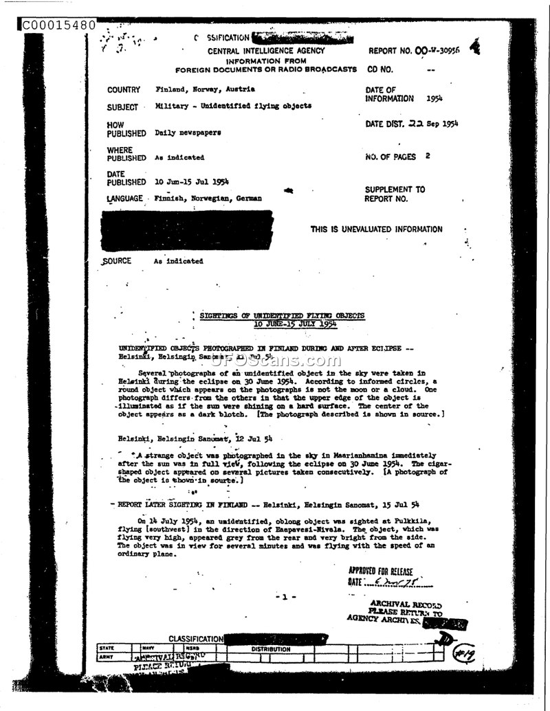 This CIA intelligence report summarizes newspaper accounts of UFO sightings in Finland, Norway, and Austria during the summer of 1954. It includes reports of photographic and motion picture evidence of unidentified aerial objects.