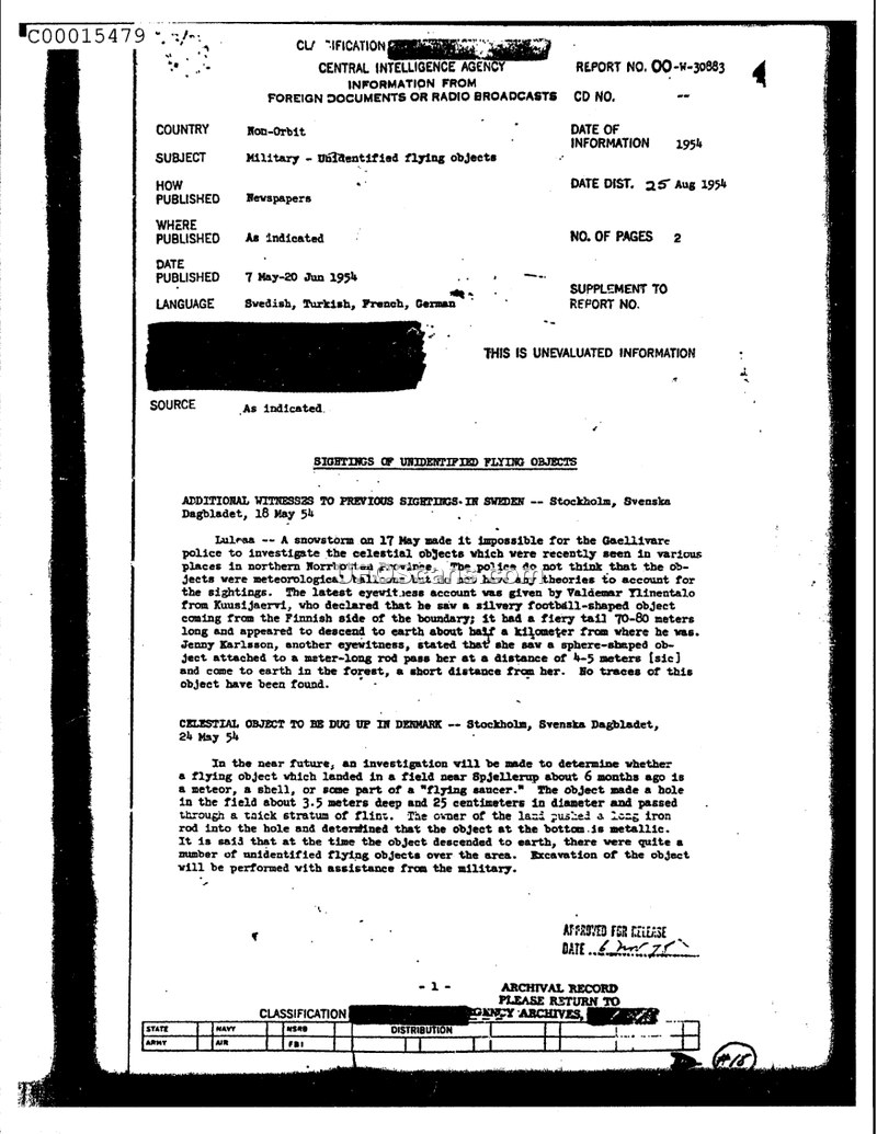 This Central Intelligence Agency report, dated August 25, 1954, serves as a compilation of sightings of unidentified flying objects reported in various international newspapers between May and June 1954. The document details several distinct incidents. In Lulea, Sweden, witnesses Valdemar Ylinentalo and Jenny Karlsson reported a silvery, football-shaped object with a 70-80 meter fiery tail, which descended near the Finnish border during a snowstorm. In Spjellerup, Denmark, plans were made to excavate a site where a flying object allegedly landed six months prior, leaving a hole 3.5 meters deep and 25 centimeters in diameter. In Mersin, Turkey, residents observed an unidentified aircraft approximately 10 meters long traveling in a straight line over the Taurus Mountains on May 7, 1954. Finally, in West Germany, two separate incidents are noted: one near Frankfurt involving glowing disks that performed a parabolic flight path and were not detected by US radar, and another near Duesseldorf where airline employees observed a shiny object that approached at high speed, turned, and disappeared above a 6,000-meter overcast layer. The document notes that the Duesseldorf witnesses explicitly ruled out airplanes, balloons, or aerial measuring devices.