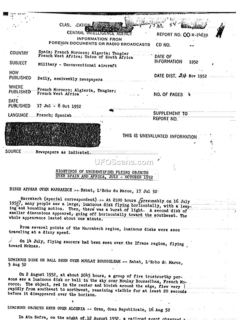 SIGHTINGS OF UNIDENTIFIED FLYING OBJECTS OVER SPAIN AND AFRICA, JULY - OCTOBER 1952