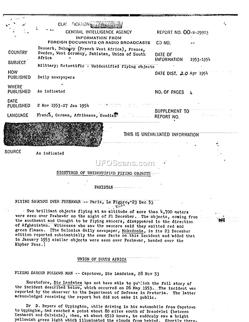 This Central Intelligence Agency report, dated April 20, 1954, compiles various newspaper accounts of unidentified flying object sightings occurring between November 1953 and January 1954 across several countries, including Pakistan, the Union of South Africa, Dahomey (French West Africa), France, Sweden, Denmark, and West Germany. In Pakistan, two brilliant objects were reported over Peshawar in December 1953. In South Africa, Dr. D. Beyers reported a luminous, yellowish-green object following his vehicle in May 1953. Dahomey recorded its first sighting of a luminous, oblong-shaped object in October 1953. France experienced multiple sightings, including a golden, round object in Bordeaux, a white disk in Nice, and a luminous machine landing at Marignane Airfield. In the region of Sweden and Denmark, several reports involved large meteors or fireballs, with experts like Bertil Lindblad of the Lund Observatory providing analysis, often attributing these sightings to meteors. The document serves as a summary of international press reports regarding these phenomena, noting that the information provided is unevaluated.