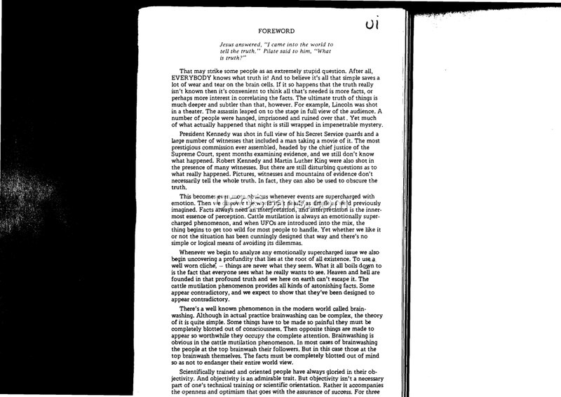 This document, titled 'Cattle Mutilation: The Unthinkable Truth' by Fredrick W. Smith, published in 1976, provides a comprehensive examination of the cattle mutilation phenomenon occurring in the United States, particularly in Colorado. The author posits that the mutilations are not the work of natural predators, such as coyotes, nor are they the result of human cult activity, despite official claims by the Colorado Bureau of Investigation (CBI) and other authorities. Smith argues that the precision of the surgical excisions—often involving the removal of reproductive organs, tongues, and eyes without blood loss—suggests a highly advanced, non-human technology. The text details numerous reports from ranchers and law enforcement officials regarding sightings of unidentified aerial phenomena (UAP), specifically silent, unmarked helicopters and bright lights, often in the vicinity of military installations like NORAD and Cheyenne Mountain. The author criticizes the government's handling of the situation, alleging a deliberate policy of suppression and disinformation to prevent public panic and to conceal the reality of extraterrestrial presence. Smith explores various theories, including the 'predator' theory and the 'cult' theory, dismissing both as inadequate explanations for the evidence. He suggests that the mutilations serve a purpose related to genetic research or the monitoring of Earth's resources by extraterrestrial entities. The book also discusses the role of the media and scientific community, accusing them of complicity in maintaining a 'materialistic' worldview that rejects the possibility of non-human intelligence. Throughout the text, the author weaves in religious and philosophical interpretations, suggesting that the phenomenon is part of a larger, cosmic 'judgement' or transition. The document concludes by asserting that the truth is being hidden by those in power and that the public must look beyond official narratives to understand the true nature of the UAP and cattle mutilation mystery.