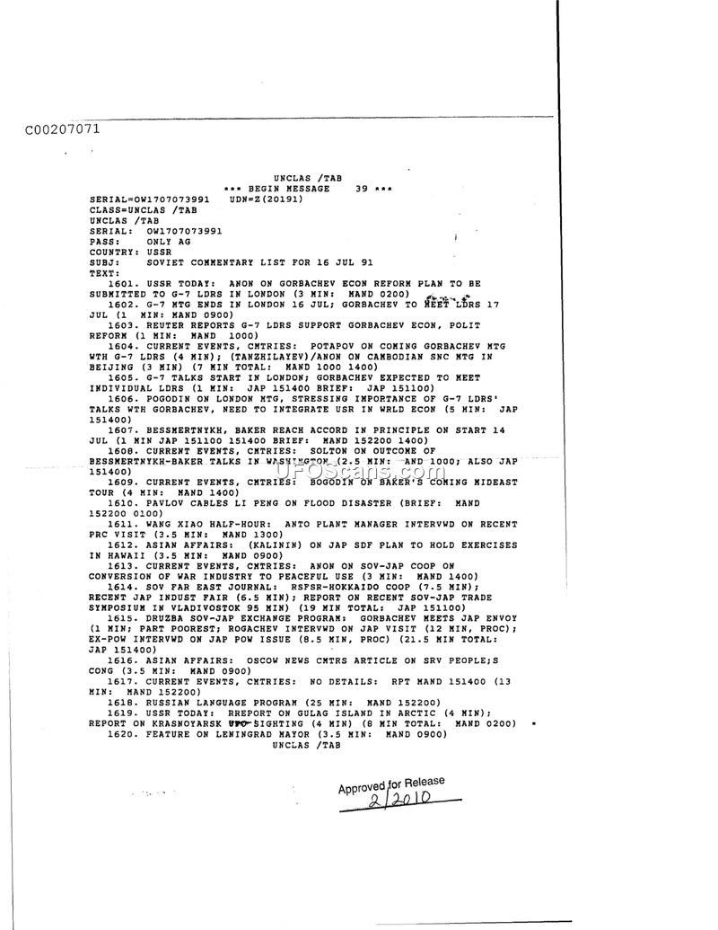 This document is a summary of Soviet media commentary for July 16, 1991. It provides a list of reports and broadcasts covering various domestic and international topics. Key political subjects include Mikhail Gorbachev's economic reform plans, the G-7 summit in London, arms control discussions between Bessmertnykh and Baker, and regional affairs involving Japan and China. The document also notes a report on a UAP sighting in Krasnoyarsk, which was allocated four minutes of broadcast time. Other topics include environmental issues, space station activities, and cultural reports.