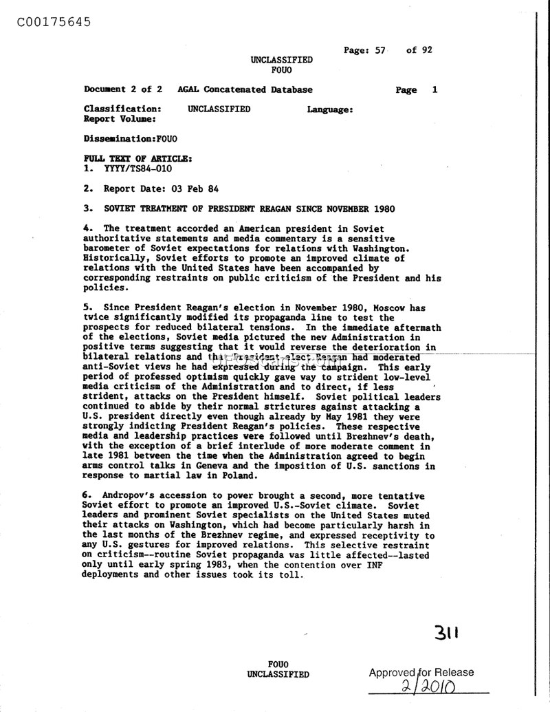 This intelligence assessment provides a chronological analysis of how the Soviet Union perceived and treated the administration of U.S. President Ronald Reagan between November 1980 and early 1984. The document categorizes Soviet reactions into three distinct levels of authority: the leadership itself, well-connected political commentators, and routine media commentary. Initially, following Reagan's election, Soviet media displayed a period of cautious optimism, hoping for a moderation of anti-Soviet policies. However, this quickly shifted to strident criticism as the administration's policies became clearer. The assessment highlights that while the Soviet leadership often avoided direct personal attacks on the President until 1983, political commentators like Aleksandr Bovin, Georgiy Arbatov, Vadim Zagladin, and Nikolay Shishlin were more vocal in condemning U.S. policies. The document details how Soviet rhetoric intensified during specific events, such as the imposition of U.S. sanctions following the declaration of martial law in Poland, the deployment of INF missiles, and the shooting down of a Korean airliner in September 1983. Throughout the period, Soviet officials, including Leonid Brezhnev and Yuriy Andropov, consistently accused the U.S. of pursuing a policy of 'strength' and 'confrontation' rather than detente. The assessment notes that the Kremlin viewed the Reagan administration as being dominated by 'ultra-reactionary' forces and 'hawks' intent on achieving military superiority and undermining the socialist system. Despite the harsh rhetoric, the document observes that the Soviet Union continued to express a desire for dialogue and summit meetings, provided they were conducted on the basis of equality and reciprocity. The assessment concludes that by early 1984, the Soviet view of the Reagan administration remained deeply skeptical, with the leadership warning of the dangers of the ongoing arms race and the U.S. 'crusade' against socialism. The document serves as a record of the diplomatic and propaganda tensions that defined the U.S.-Soviet relationship during the early 1980s.