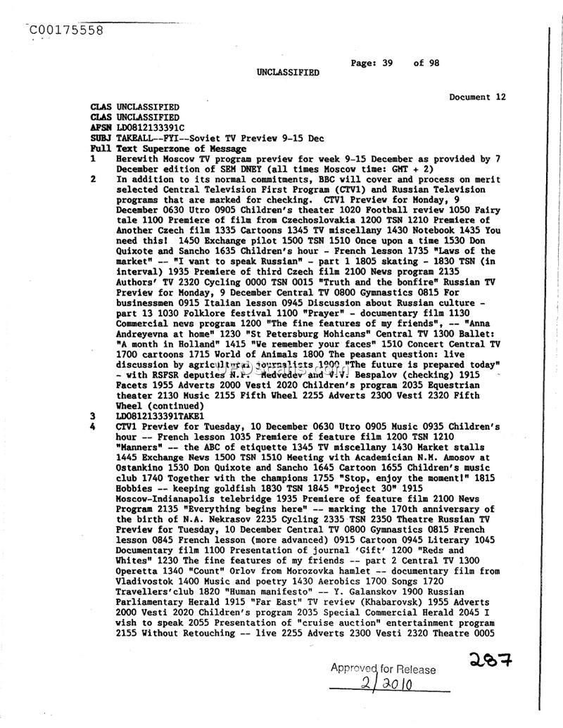 This document is a compilation of Soviet television programming schedules for the week of December 9-15, 1991, provided by the Foreign Broadcast Information Service. The text details daily broadcasts across various channels, including Central Television (CTV1) and Russian Television. The schedules encompass a wide range of content, including news programs, documentaries, children's shows, sports coverage, musical performances, and political discussions. Notable entries include a meeting with Academician N.M. Amosov, a profile of filmmaker Marlen Khutsiyev, and a discussion on agriculture featuring RSFSR deputies N.P. Medvedev and V.V. Bespalov. The document also lists various cultural and educational programs, such as language lessons, health segments, and interviews with figures like writer Vladimir Maksimov and cinema personality Yuliya Solntseva. The programming reflects the political and social climate of the Soviet Union during this period, with references to the RSFSR Supreme Soviet and various documentary films covering historical and contemporary issues.