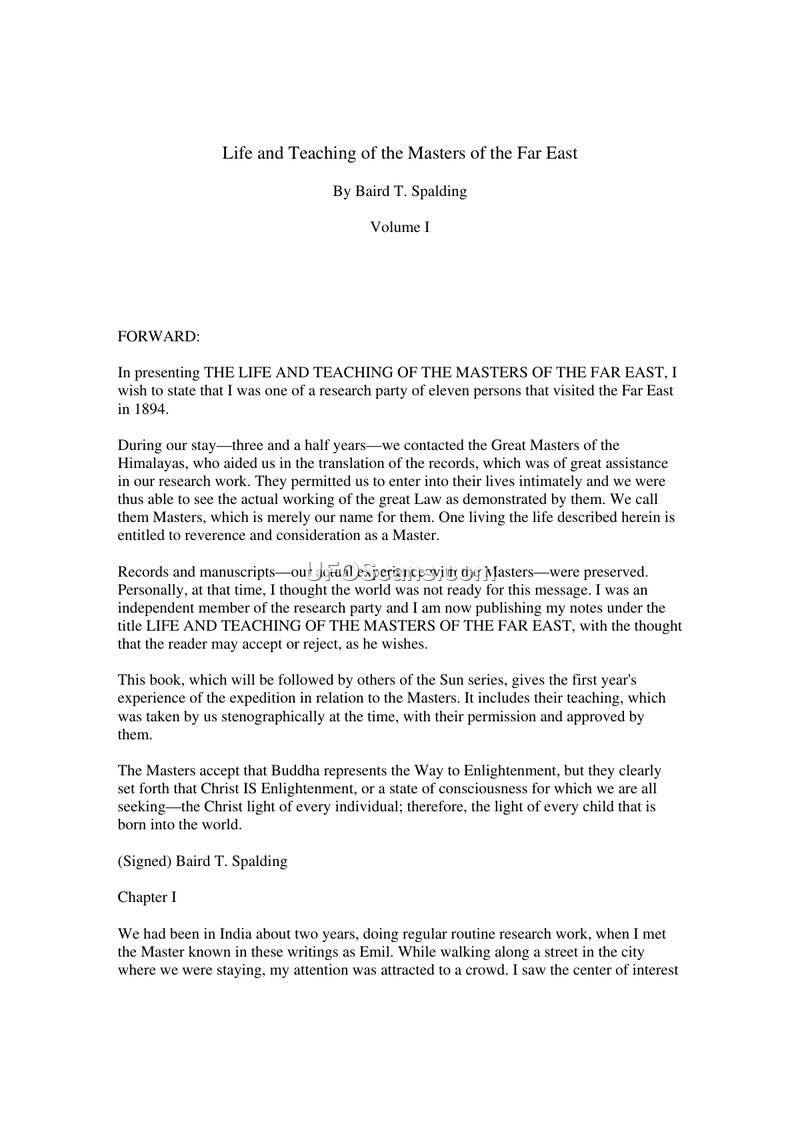 This document, Volume I of 'Life and Teaching of the Masters of the Far East' by Baird T. Spalding, recounts the experiences of an eleven-person research expedition that traveled to the Far East in 1894. The author describes contacting 'Great Masters of the Himalayas' who assisted the party in their research. Throughout the narrative, Spalding details various encounters with these Masters, specifically individuals named Emil, Jast, and Neprow. The Masters are described as possessing extraordinary capabilities, including the ability to communicate via thought transference, walk on water, survive fire, and materialize food and other items directly from the 'Universal Mind Substance.' The text asserts that these Masters have overcome death, with some living for hundreds of years. A significant portion of the document is dedicated to the teachings provided by these Masters, which focus on the concept of 'Christ Consciousness'—defined not as a specific religious figure, but as a state of consciousness available to all individuals. The Masters argue that Jesus of Nazareth was a teacher who demonstrated this consciousness and that all humans possess the same potential to perform similar 'miracles' by recognizing their own divinity and connection to God. The narrative also includes accounts of healing, where individuals were cured of various ailments through silent declaration and the influence of the Masters. The author describes visiting temples, such as the 'Silence Temple' and the 'Healing Temple,' and recounts the Masters' perspective on history, suggesting that their records predate known history and that the Bible contains accounts derived from these ancient teachings. The document concludes with the author's reflection on the profound nature of these experiences, emphasizing that the Masters do not claim supernatural authority but rather demonstrate the application of a 'great Law' that is accessible to all of humanity. The author expresses a personal belief in the authenticity of these encounters and the potential for these teachings to usher in a new age of spiritual understanding.
