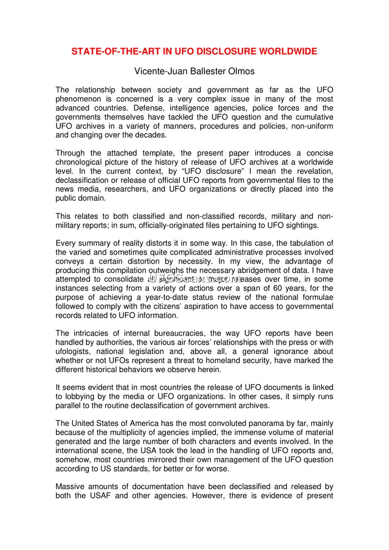 This paper, authored by Vicente-Juan Ballester Olmos and dated September 15, 2011, provides a comprehensive overview of the state of UFO disclosure worldwide. The author defines 'UFO disclosure' as the revelation, declassification, or release of official governmental UFO reports to the public domain. The document emphasizes that the relationship between governments and the UFO phenomenon is complex, characterized by varying administrative procedures, internal bureaucracies, and differing levels of transparency. The United States is identified as the most significant actor in this history, having generated a massive volume of material and established standards that many other nations have mirrored. The author notes that the release of documents is frequently linked to external pressure from media and UFO organizations rather than routine declassification. The paper includes a detailed 'Worldwide UFO Disclosure Template' that tracks specific release events by country, covering the United States, Brazil, Australia, Argentina, Canada, Sweden, New Zealand, France, Spain, Italy, Uruguay, Russia, the United Kingdom, Chile, Norway, Belgium, Portugal, Switzerland, the Philippines, Peru, Mexico, Ecuador, Ireland, Rumania, Denmark, Greece, Finland, Indonesia, and Japan. The author highlights that while Europe and Australasia have demonstrated high levels of professionalism in their disclosure processes, Central and South American countries have generally struggled with systematic development. The author also addresses the ongoing challenges of disclosure, such as the withholding of information by intelligence agencies like the CIA and NSA, the potential destruction or loss of records, and the skepticism surrounding the impact of administrative transparency laws. The paper concludes with a recommendation for UFO researchers to formally contact their respective defense staffs to argue that UFO phenomena do not represent a threat to national security, that investigation should be scientific, and that withholding information is incompatible with democratic policy. The author asserts that the history of interaction between Departments of Defense and the intelligence community regarding UFO reporting remains largely unwritten and calls for academic scholars to engage with this subject matter.