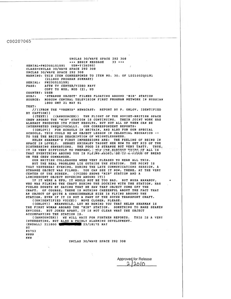 A 1991 Soviet television report details the sighting of an unidentified, luminescent object near the MIR space station. Cosmonaut Musa Manarov reported seeing the object emerge from the spacecraft during docking.