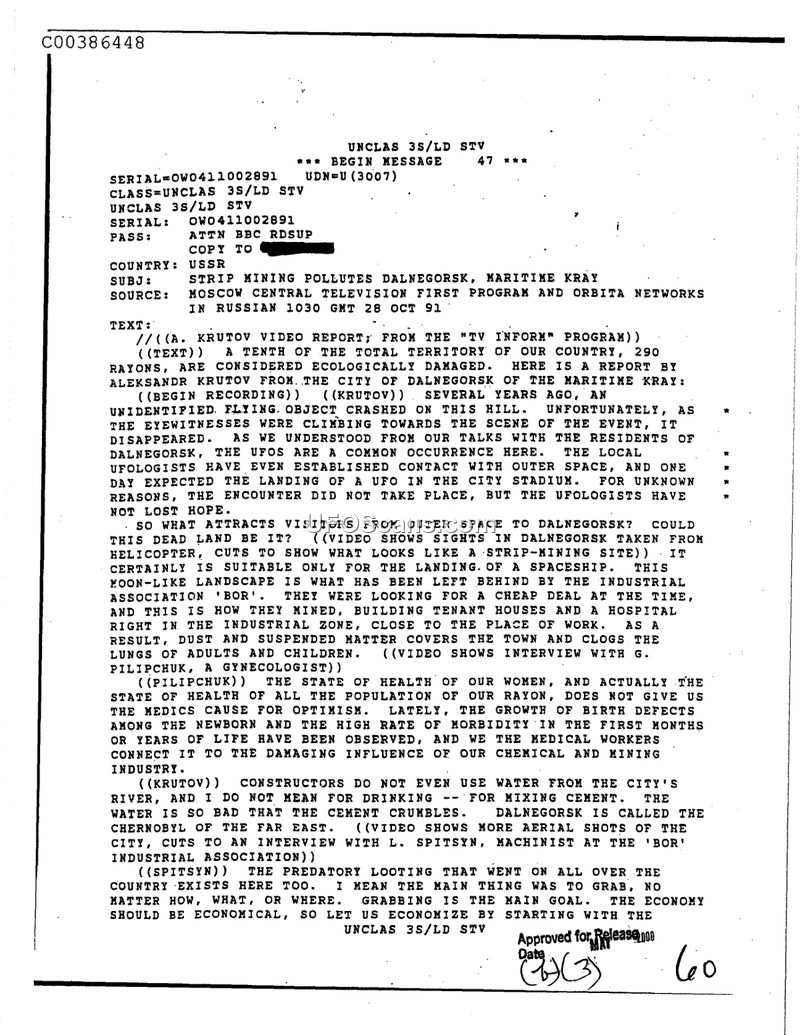 This document is a transcript of a report from the Moscow Central Television First Program and Orbita Networks, dated October 28, 1991. The report, presented by Aleksandr Krutov, focuses on the severe environmental degradation in the city of Dalnegorsk, Maritime Kray, attributed to strip mining operations by the 'BOR' industrial association. The report highlights that the mining has caused significant pollution, affecting the health of the local population, including high rates of morbidity among newborns. Within this context, the report mentions that several years prior, an unidentified flying object crashed on a hill in Dalnegorsk. The reporter notes that local ufologists have maintained interest in the area, even expecting a landing at the city stadium. The document also features an interview with L. Spitsyn, a machinist at the 'BOR' association, who discusses the economic and administrative failures of the system, noting that the 'predatory looting' of the country's resources is the primary issue. The report concludes by noting that while nine billion rubles were recently invested in ecology, the damage to nature is estimated at 43 billion rubles, and residents continue to hope for visitors from outer space to help solve their terrestrial problems.