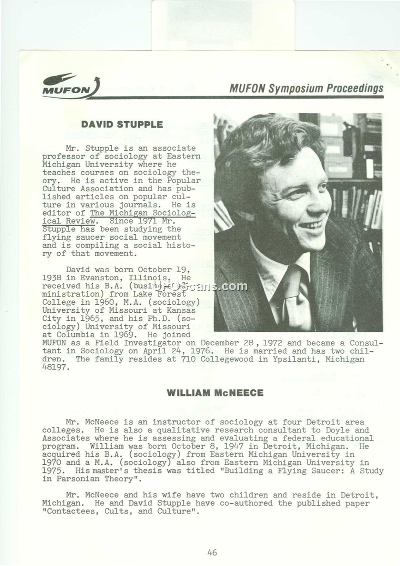 This document provides biographical sketches of two individuals, David Stupple and William McNeece, as part of the MUFON Symposium Proceedings. David Stupple is identified as an associate professor of sociology at Eastern Michigan University. Born on October 19, 1938, in Evanston, Illinois, Stupple holds degrees from Lake Forest College, the University of Missouri at Kansas City, and the University of Missouri. He is noted for his academic work in sociology and his research into the flying saucer social movement, which he has been studying since 1971. He joined MUFON as a Field Investigator on December 28, 1972, and became a Consultant in Sociology on April 24, 1976. He resides in Ypsilanti, Michigan. William McNeece is described as an instructor of sociology at four Detroit area colleges and a qualitative research consultant. Born on October 8, 1947, in Detroit, Michigan, McNeece earned his B.A. and M.A. in sociology from Eastern Michigan University. His master's thesis was titled 'Building a Flying Saucer: A Study in Parsonian Theory.' He resides in Detroit with his wife and two children. The document notes that Stupple and McNeece have co-authored a paper titled 'Contactees, Cults, and Culture.'