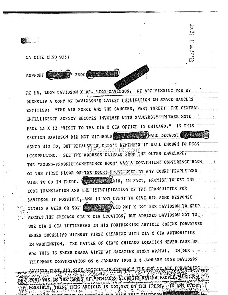 The document discusses Dr. Leon Davidson's publication regarding the CIA's involvement with space saucers, specifically noting a visit he made to a CIA office in Chicago. The authors advise Davidson not to use CIA letterhead in his upcoming article without clearance and express a desire to be relieved of further dealings with him.