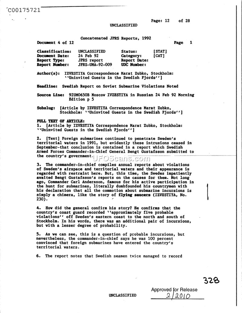 This document, a JPRS report from February 1992, details the ongoing issue of foreign submarine incursions into Swedish territorial waters. The report highlights the perspective of Swedish Armed Forces Commander-in-Chief General Bengt Gustafsson, who maintained that foreign submarines had indeed violated Swedish waters, despite skepticism from some who compared the submarine sightings to the 'chimera' of flying saucers. The text notes that Swedish authorities recorded submarine noises similar to those identified in 1984 and discovered physical damage to an underwater anti-submarine warning cable in a bay off Gotland Island. The report discusses the difficulty of identifying the origin of these vessels, noting that while some suspected the former USSR, others pointed to reports of U.S. mini-submarines operating in the area for research purposes. In response to these persistent incursions, General Gustafsson ordered the Swedish coast guard to act more aggressively, including opening fire if sonar detected the presence of unidentified mini-submarines. Defense Minister Anders Bjork reaffirmed the government's commitment to protecting Swedish waters, stating that the nation would not reconcile itself to such violations.