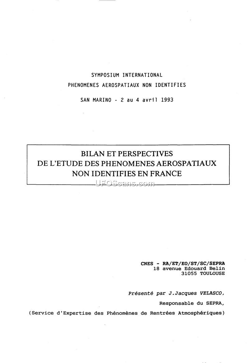 This document is a presentation from the 1993 International Symposium on Unidentified Aerospace Phenomena in San Marino, authored by J. Jacques Velasco, head of the French SEPRA (Service d'Expertise des Phénomènes de Rentrées Atmosphériques). The document outlines the history, methodology, and objectives of the French government's official study of UAP, which began under GEPAN in 1977 and continued under SEPRA within the CNES (Centre National d'Études Spatiales). The author emphasizes that France is one of the few countries to have organized an objective, scientific study of these phenomena, free from political or media pressures. The core of the French methodology is the 'tetrahedron' model, which analyzes four distinct 'observables': the witness, the testimony, the physical environment, and the psychosocial environment. This approach is designed to move beyond simple, reductionist interpretations and to provide a rigorous framework for evaluating reports. The document highlights the importance of cooperation with official bodies such as the Gendarmerie Nationale, the military, and various scientific laboratories to ensure data quality. A significant portion of the document is dedicated to the case of November 5, 1990, where a large, silent, luminous triangle was reported across France. Initially compared to similar sightings in Belgium, the SEPRA's investigation, aided by data from NASA, determined that the event was the atmospheric reentry of the third stage of a Soviet Proton rocket that had launched a Gorizon 21 satellite. This case is presented as a success story for the SEPRA's mission to provide clear, objective information to the public and prevent media-driven panic. The document also discusses the classification system used for reports, ranging from Class A (identified) to Class D (unidentified). It notes that while many reports are identified as conventional phenomena (aircraft, balloons, meteors, etc.), a small percentage remain unidentified and warrant further scientific study. The author concludes by advocating for the establishment of a similar, impartial European structure to collect and analyze UAP data, emphasizing that the goal is not to prove or disprove the existence of extraterrestrial craft, but to study unidentified phenomena with the rigor of science.