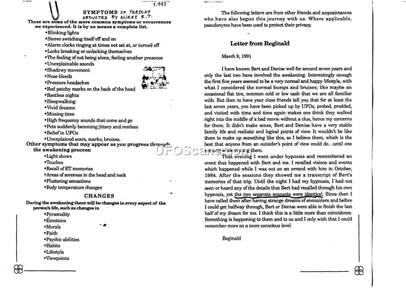 This document serves as a reference guide for symptoms associated with alien abduction, followed by a personal letter from an individual named Reginald, dated March 9, 1991. The first section lists various physical, environmental, and psychological symptoms attributed to abduction, including technological malfunctions like blinking lights and self-activating alarms, physical ailments such as nosebleeds and headaches, and psychological phenomena like missing time and vivid dreams. It also notes that the 'awakening process' involves further symptoms such as light shows, touches, and recall of ET memories, alongside changes in personality, emotions, morals, faith, psychic abilities, habits, lifestyle, and viewpoints. The second section is a letter from Reginald, who describes his acquaintances, Bert and Denise. Reginald claims that after knowing them for seven years, he learned they had been subjected to UFO-related encounters. He recounts an event where he underwent hypnosis and recalled a specific incident from October 1984. Upon comparing his memories with a transcript of Bert's own hypnotic session, Reginald asserts that their accounts were identical, which he interprets as evidence of a shared experience rather than coincidence.