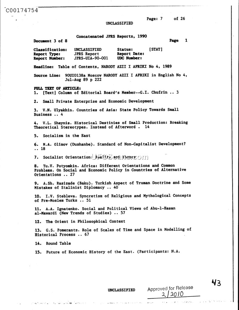 Table of Contents, NARODY AZII I AFRIKI No 4, 1989