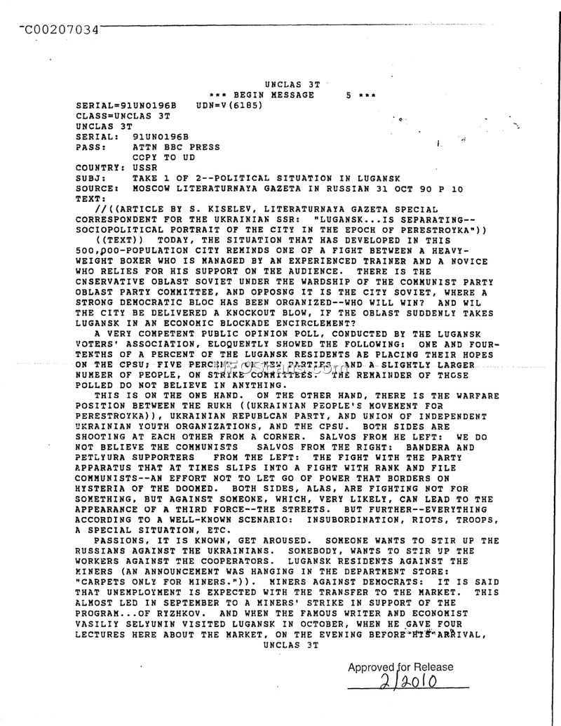 This document provides a 1990 report on the political instability and rising separatist sentiment in Lugansk, Ukraine. It highlights the ideological conflict between local Soviet authorities and democratic movements during the final years of the USSR.