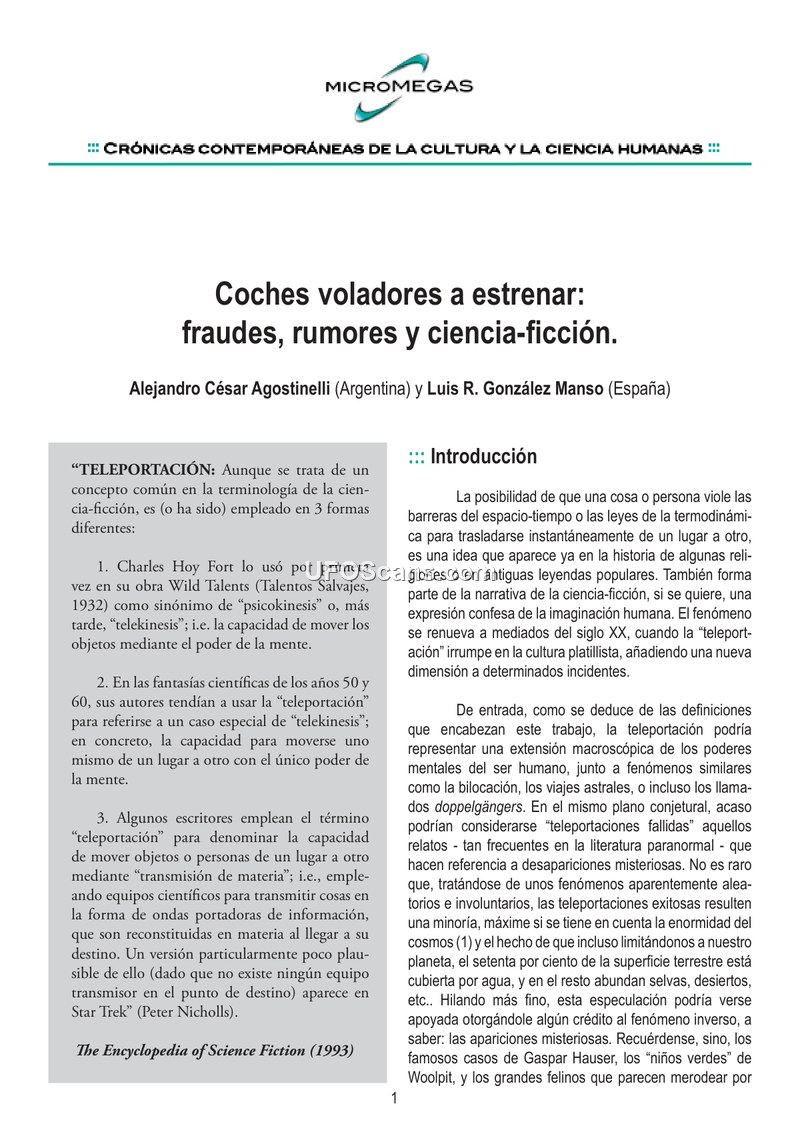 This document is an analytical article titled 'Coches voladores a estrenar: fraudes, rumores y ciencia-ficción' (Brand New Flying Cars: Frauds, Rumors, and Science Fiction) by Alejandro César Agostinelli and Luis R. González Manso. The authors examine the phenomenon of 'teleportation' stories involving automobiles, which became a recurring theme in UFO literature and urban legends starting in the mid-20th century. The central focus is the 'Vidal Case' of 1968, in which a couple allegedly disappeared while driving in Argentina and reappeared in Mexico 48 hours later. The authors document how this story was popularized by ufologists like Oscar A. Galíndez and later revealed to be a fabrication by filmmaker Anibal Uset to promote his film 'Che, Ovni'. The article traces the evolution of these narratives, noting how they adapt to contemporary settings and often incorporate common tropes such as 'missing time', mysterious fog, and vehicle damage (e.g., paint appearing burned by a blowtorch). The authors also analyze other similar cases, including incidents in Brazil, Spain, and Australia (such as the 1971 Queensland case investigated by Bill Chalker). They argue that these stories function as 'urban legends' shaped by the 'extraterrestrial hypothesis' (HET), which acts as a cultural prism through which people interpret ambiguous experiences. The authors conclude that while these stories are often presented as genuine, they are consistently impossible to verify, frequently lacking direct contact with the alleged protagonists, and are often revealed to be hoaxes or misinterpretations of mundane events. The document serves as a critical historical review of how UFO-related folklore is constructed, disseminated, and eventually debunked.
