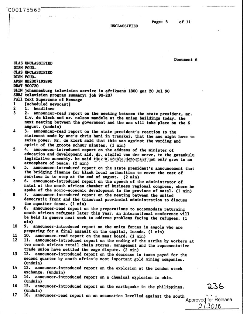 This document is a news summary from July 20, 1990, covering South African political events and various international news stories, including a brief mention of UFO-related land imprints in England.