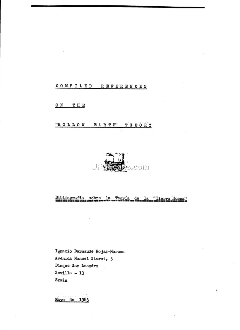 This document is a comprehensive bibliography titled 'Compiled References on the Hollow Earth Theory,' authored by Ignacio Darnaude Rojas-Marcos and dated May 1983. The document serves as a reference guide for literature, books, and articles concerning the theory that the Earth is hollow. The bibliography lists a wide array of publications, including works by authors such as Raymond W. Bernard, Timothy G. Beckley, Dr. M. Doreal, and Ray Palmer. The entries span various decades, with some dating back to the late 19th century. The document also includes a specific section titled 'Alleged Beings Living Underworld Below the Surface of the Earth,' which lists 'Seance Memoranda' communications received through the medium Mark Probert and edited by the Borderland Foundation. These memoranda detail specific trance lectures and communications from various entities, including 'Lao-Tse,' 'Lo Sun Yat,' 'E.Yada di Shi'ite,' 'Professor Alfred Luntz,' 'Maharajah Natcha,' and 'Professor Harry La Verne Twining,' spanning the years 1947 to 1952. The bibliography covers international sources, including publications from Spain, Argentina, Italy, France, and the United Kingdom, alongside numerous American publishers specializing in esoteric and fringe topics. The document provides a structured list of titles, often including publication details such as publisher, year, and occasionally price or page count, intended to assist researchers in locating materials related to the Hollow Earth hypothesis.