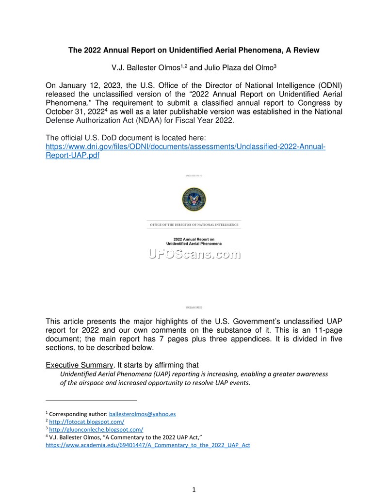 This document is a critical review of the U.S. Government's 2022 Annual Report on Unidentified Aerial Phenomena (UAP), authored by V.J. Ballester Olmos and Julio Plaza del Olmo. The authors analyze the report's claims regarding the increase in UAP reporting, which the ODNI attributes to better awareness and reduced stigma. The authors reject this, arguing instead that the rise in reports is a direct result of increased media coverage and the institutional promotion of the UAP subject by the Department of Defense, NASA, and the AIAA. They contend that the atmosphere and airspace have been studied for decades and that the current focus on UAP is largely a justification for the existence of the All-Domain Anomaly Resolution Office (AARO). The authors highlight that as of August 30, 2022, there were 510 total UAP reports, yet they criticize the lack of technical detail provided in the unclassified report, contrasting this with the transparency of other national UAP study centers in France, Argentina, and Chile. They further argue that the majority of reports are likely misidentifications of common objects such as balloons and drones, and that the 'unusual flight characteristics' mentioned in the report are likely the result of sensor irregularities or operator error. The authors conclude that while the establishment of AARO and its network of interagency cooperation is a positive step for data collection, the lack of transparency and the absence of clear, ultimate goals for the office remain significant issues. They express doubt that the government will find evidence of alien life or advanced technology, suggesting that the project is essentially 'reinventing the wheel' and will ultimately reach the conclusion that UAP are not proof of anomalous phenomena.