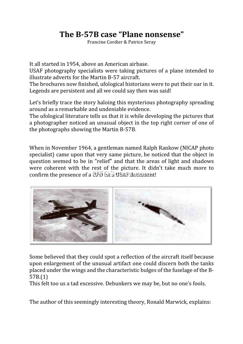 This document, authored by Francine Cordier and Patrice Seray in October 2003, provides a critical analysis of a well-known ufological photograph featuring a Martin B-57B aircraft. The photograph, originally taken in 1954 for advertising purposes, became a subject of intense interest within the ufological community after an unusual object appeared in the top right corner of certain prints. In 1964, Ralph Rankow of NICAP identified the object as appearing in 'relief' and consistent with the lighting of the scene, leading to claims that it was a genuine UFO captured on a USAF document. The authors investigate the history of this image, noting that while some theorists suggested it was a reflection of the aircraft, others viewed it as a legitimate anomaly. Through their research, the authors discovered that the photograph exists in multiple versions. They cite an aeronautical magazine, 'Connaissance de l'Histoire' (March 1980), which published the same image without the object. Furthermore, they reference information from Gilles Durand of the SCEAU, who possesses a version of the photograph that is free of any UFO. The authors conclude that the 'UFO' is an accidental artifact caused by dust or a scratch on the negative, which appeared in later prints. They argue that the persistence of the legend is due to the lack of examination of the original negative and the tendency of some ufologists to embrace such images without sufficient verification. The document serves as a debunking of the claim, highlighting the importance of provenance and technical analysis in evaluating photographic evidence.