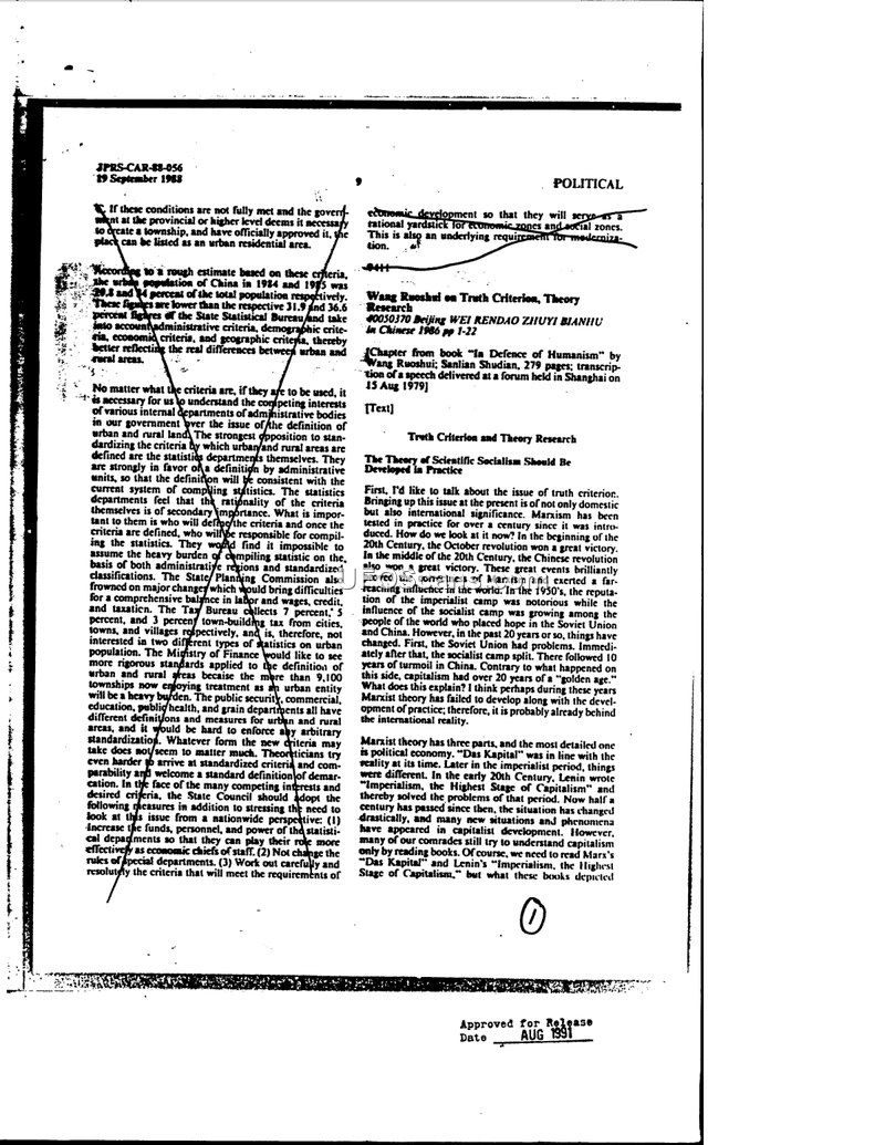 This document, JPRS-CAR-88-056, dated September 19, 1988, is a compilation of political articles translated from Chinese sources. The primary focus of the text is the ongoing debate regarding Marxist theory, the interpretation of Mao Zedong Thought, and the necessity of ideological reform within the Chinese political landscape. The articles explore the 'truth criterion,' the historical evolution of socialist thought, and the challenges of applying rigid ideological frameworks to a changing society. Several authors discuss the need to move beyond dogmatism, emphasizing that Marxism must be tested through practice and that the party should not fear criticism. The text also addresses the 'crisis of Marxism' as discussed by Fudan University graduate students, suggesting that current textbooks are outdated and that new research is required. Amidst these theoretical discussions, there is a brief, incidental mention of 'flying saucers' (UFOs). The author uses the term as a philosophical example to illustrate how human knowledge evolves: initially, people saw unidentified flying objects, but through research and study, the concept was defined and named. This serves as a metaphor for the broader argument that political and social concepts must be continuously re-evaluated and refined through empirical observation and practice rather than relying on static, historical interpretations.