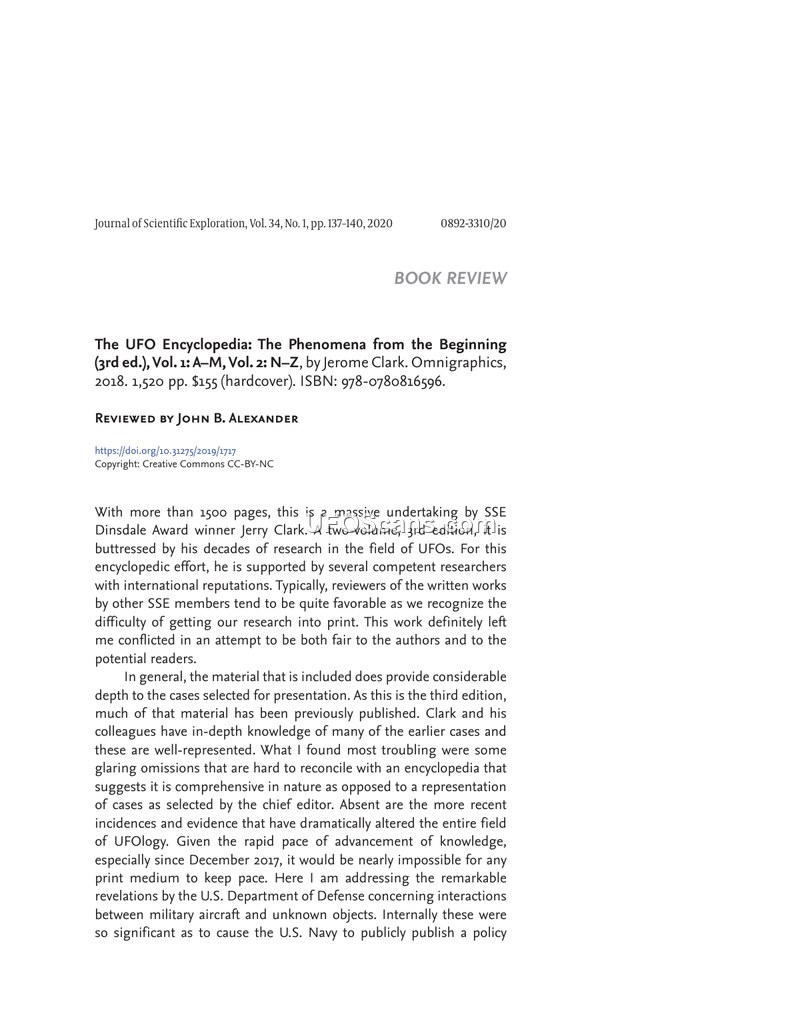 This document is a book review of the third edition of 'The UFO Encyclopedia: The Phenomena from the Beginning' by Jerome Clark, published in 2018. The review, written by John B. Alexander for the Journal of Scientific Exploration, acknowledges the massive scale of the two-volume work and the decades of research behind it. Alexander notes that the encyclopedia provides considerable depth for many historical cases. However, he expresses significant conflict regarding the work, citing 'glaring omissions' that undermine its claim to be comprehensive. Specifically, he points to the absence of recent developments, such as the U.S. Department of Defense's revelations regarding military interactions with unknown objects since December 2017. Alexander also criticizes the exclusion of influential figures and cases, including Phil Corso and his book 'The Day After Roswell', Steven Greer, and filmmaker James Fox. He highlights the inadequate coverage of the Bentwaters (Rendlesham Forest) incident and the omission of the International UFO Congress and its coordinator, Alejandro Rojas. Furthermore, he notes that the index and bibliography are inconsistent, failing to include some researchers mentioned in the text. Alexander concludes that while the encyclopedia may be of interest to history buffs, the print medium is anachronistic and the content represents a biased sample of the field.