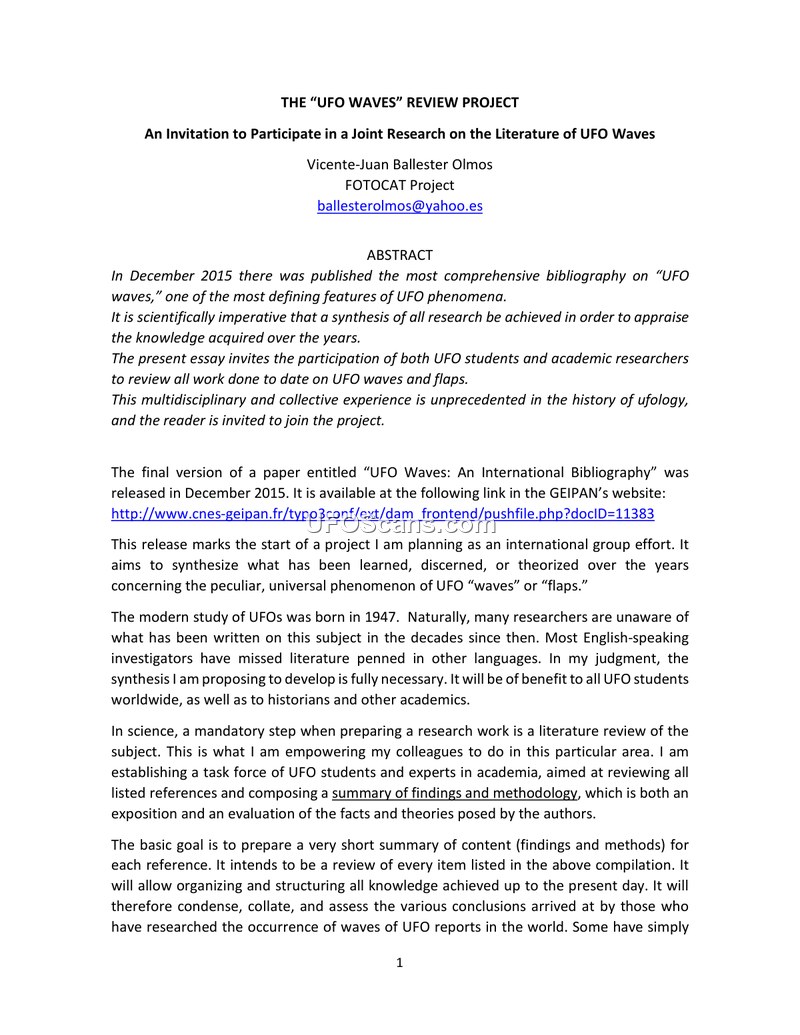 This document is a formal invitation from Vicente-Juan Ballester Olmos, associated with the FOTOCAT Project, to participate in the 'UFO Waves Review Project.' The author identifies a critical need for a comprehensive synthesis of existing research on UFO waves and flaps, noting that the modern study of UFOs, which began in 1947, has suffered from a lack of organized, cumulative knowledge. Many researchers are reportedly unaware of literature published in languages other than English or in obscure sources. To address this, the project seeks to recruit a task force of UFO students and academic experts to review items from a previously published bibliography titled 'UFO Waves: An International Bibliography,' released in December 2015. Participants are asked to write brief abstracts of findings and methodologies for selected items, which will then be compiled into a multi-author database. The project is under the general supervision of Ballester Olmos, with Spanish physicist Julio Plaza del Olmo serving as the coordinator responsible for corresponding with volunteers and managing the input. The author emphasizes that the goal is to create a 'consultation reservoir' that will allow for a quick overview of the state-of-the-art in UFO research, including the identification of strong and weak points in existing literature. The document outlines the methodology for the review, which includes categorizing items into specific topics such as waves prior to 1947, contemporary waves, general research, and various theories and hypotheses. While there is no strict deadline, the author suggests 31 December 2016 as a reasonable target for completion. The document concludes by stressing the importance of this work in establishing solid, objective foundations for future ufological research, moving away from the current state where major findings are often lost in a 'morass of worthless articles.'