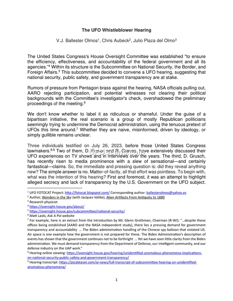 This document provides a critical analysis of the July 26, 2023, U.S. Congressional hearing on Unidentified Anomalous Phenomena (UAP). The authors, V.J. Ballester Olmos, Chris Aubeck, and Julio Plaza del Olmo, argue that the hearing was a redundant and politically motivated event that failed to produce new, verifiable evidence. The hearing featured testimony from three individuals: retired Navy Commander David Fravor, former military pilot Ryan Graves, and former intelligence officer David Grusch. The authors note that Fravor and Graves recounted well-known sightings that have been previously analyzed and often attributed to conventional aircraft or sensor artifacts. David Grusch, however, made sensational claims regarding a multi-decade UAP crash retrieval and reverse-engineering program, as well as the recovery of non-human biologics. The authors highlight that Grusch provided no direct evidence, relying entirely on hearsay and refusing to discuss details in public, citing confidentiality. The document contrasts the lack of skepticism from many Republican congressmen with the more rigorous questioning by Representative Jared Moskowitz. Furthermore, the authors include a statement from Sean M. Kirkpatrick, Director of AARO, which refutes Grusch's claims and notes that the central source refused to speak with AARO. The authors conclude that the hearing amplified dubious claims that AARO must now work to disprove, and they reiterate that after 76 years of investigation, no UAP case has proven to be irreconcilable with human-made technology.