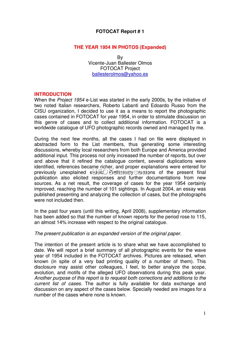 FOTOCAT Report #1, authored by Vicente-Juan Ballester Olmos in April 2008, provides an expanded, comprehensive catalogue of UFO photographic records from the year 1954. The report was initiated following the creation of the Project 1954 e-List in the early 2000s, which facilitated collaboration among international researchers, including Roberto Labanti and Edoardo Russo of the CISU organization. The primary objective of the FOTOCAT project is to serve as a worldwide, objective catalogue of UFO photographic and film records. The report details 115 specific cases from 1954, providing for each entry the date, time, location, photographer, format, explanation, references, and remarks. The author notes that the 1954 wave was a peak year for UFO reports, with a significant increase in activity compared to other years in the decade. A statistical analysis of the data reveals that a large proportion of the reports are identified as IFOs (Identified Flying Objects), often attributed to lens flares, fakes, or misidentifications. The report highlights that the October-November 1954 wave was predominantly a European phenomenon, with high concentrations of reports from France and Italy. The author argues that the wave in Europe may have been influenced by sociological factors, such as the publication of popular books on flying saucers and extensive media coverage. The report also includes an appendix of 'rarities' and failed attempts at photography, such as gun camera footage. The author stresses the necessity of 'counter-inquiries' and the role of local investigators in refining the quality of documentation. The report concludes that while the 1954 wave is well-documented, many cases remain poorly understood, and the author calls for further data exchange and corrections to the current catalogue to improve the overall understanding of the phenomenon.