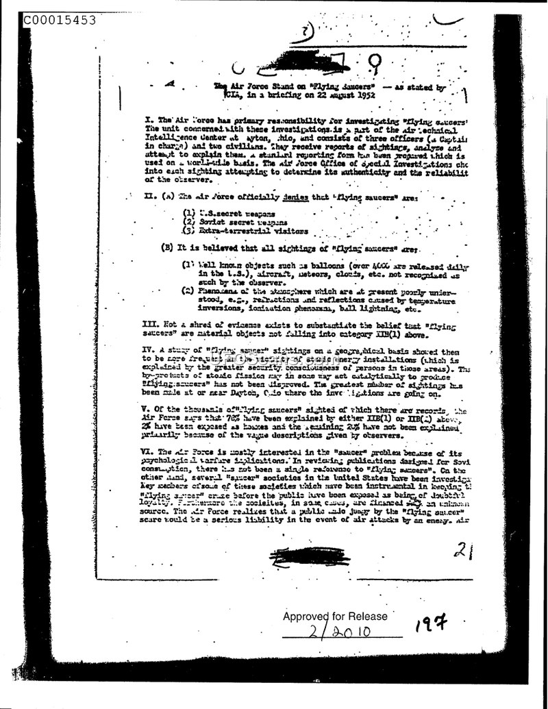 The Air Force Stand on 'Flying Saucers' — as stated by CIA, in a briefing on 22 August 1952