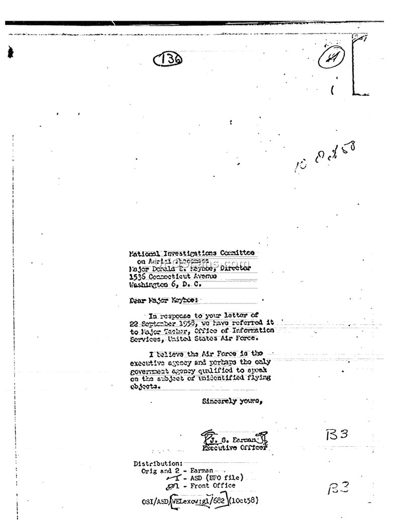 This document is a formal letter dated October 10, 1958, written by J. S. Earman, an Executive Officer within the United States Air Force. The letter is addressed to Major Donald E. Keyhoe, the Director of the National Investigations Committee on Aerial Phenomena (NICAP), located at 1536 Connecticut Avenue, Washington 6, D.C. The correspondence serves as a response to a letter previously sent by Major Keyhoe on September 22, 1958. In the letter, Earman informs Keyhoe that his inquiry has been officially referred to Major Tacker of the Office of Information Services, United States Air Force. The document concludes with a statement of the Air Force's position, asserting that the Air Force considers itself the executive agency and potentially the only government entity qualified to address the subject of unidentified flying objects. The document includes distribution information, noting copies were sent to the Air Force's UFO file and the Front Office, and bears the reference number OSI/ASD/WELexov:gl/682.
