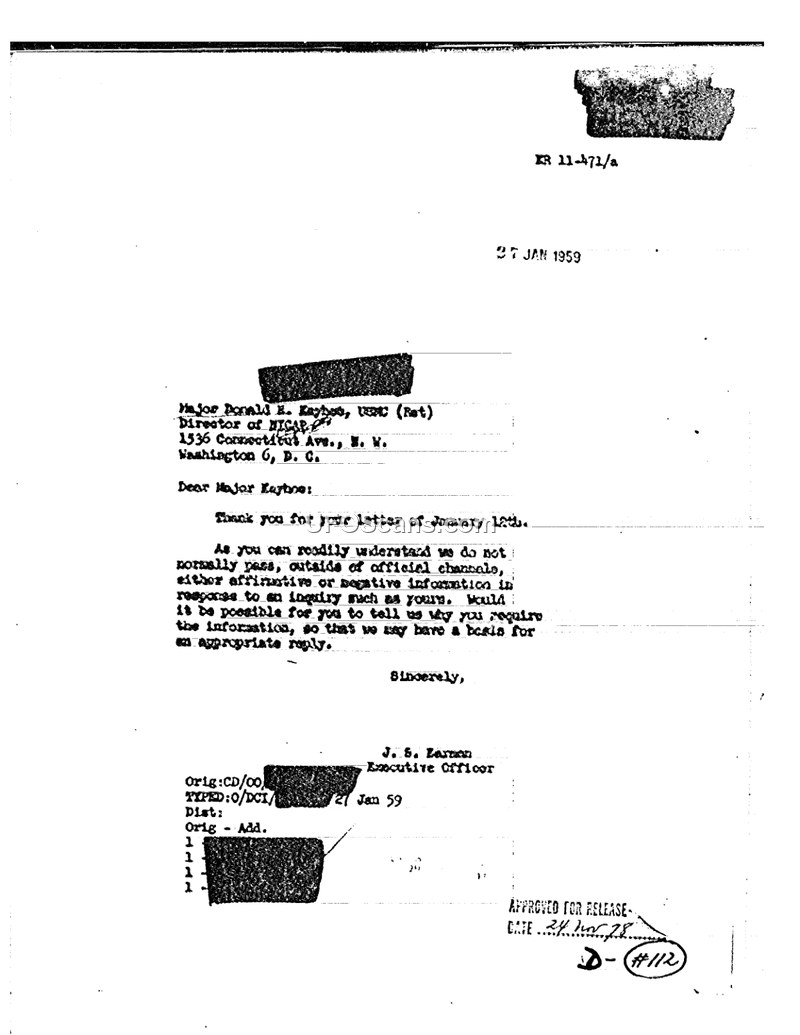 This document is a formal letter dated January 27, 1959, addressed to Major Donald E. Keyhoe, USMC (Ret), in his capacity as the Director of NICAP. The letter, signed by J. S. Earman, Executive Officer, serves as a response to an inquiry previously submitted by Major Keyhoe on January 12, 1959. In the correspondence, the author declines to provide the requested information, stating that the organization does not normally pass information outside of official channels, whether affirmative or negative. The author further requests that Major Keyhoe explain the reasoning behind his need for the information so that the agency may determine if there is a basis for providing an appropriate reply. The document bears a stamp indicating it was approved for release on November 24, 1978.