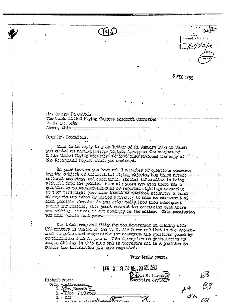 This document is a formal letter dated February 6, 1959, addressed to Mr. George Popovich of The Unidentified Flying Objects Research Committee. The letter serves as a reply to Mr. Popovich's inquiry dated January 21, 1959, regarding the subject of Unidentified Flying Objects. The author acknowledges receipt of the Fitzgerald Report, which Mr. Popovich had enclosed with his original letter. The author explains that the Agency has no jurisdiction or responsibility regarding UFO matters, asserting that this responsibility lies entirely with the U.S. Air Force. Furthermore, the letter references a past expert panel that evaluated the threat posed by reported sightings, concluding that there was nothing inimical to national security in the matter, a conclusion that was made public the previous year. The document concludes by stating the Agency is unable to provide the requested information due to its lack of jurisdiction.