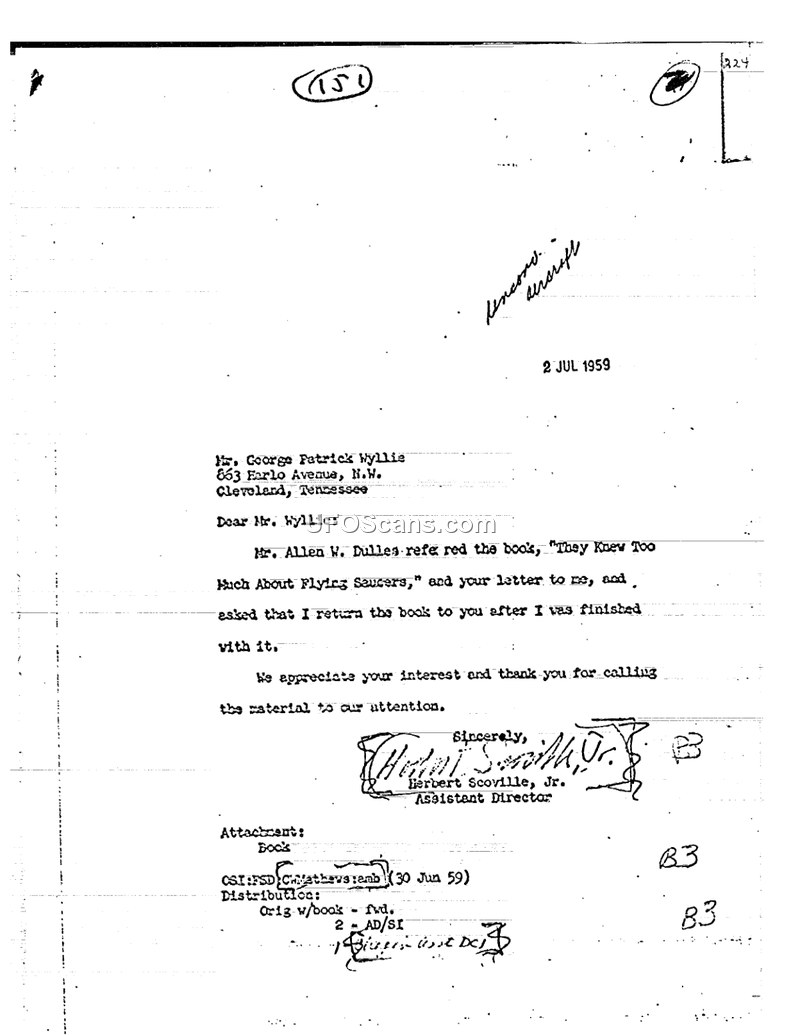 This document is a formal letter dated July 2, 1959, from Herbert Scoville, Jr., an Assistant Director at the Central Intelligence Agency, to Mr. George Patrick Wyllie of Cleveland, Tennessee. The letter serves as a response to Mr. Wyllie regarding a book titled 'They Knew Too Much About Flying Saucers.' Mr. Scoville informs Mr. Wyllie that Allen W. Dulles had referred the book and Mr. Wyllie's previous letter to him. The primary purpose of the correspondence is to return the book to Mr. Wyllie after it had been reviewed by the agency. The letter concludes with a brief expression of appreciation for Mr. Wyllie's interest and for bringing the material to the agency's attention.