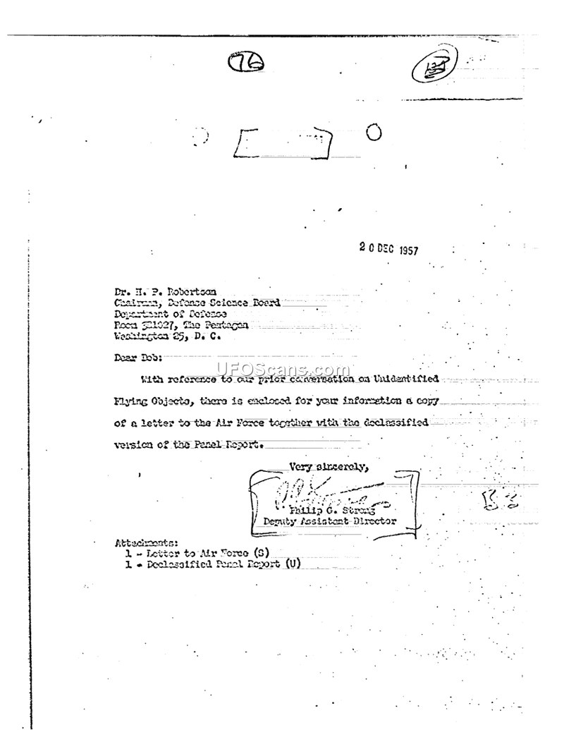 This document is a formal letter dated December 20, 1957, authored by Philip G. Strong, Deputy Assistant Director, and addressed to Dr. H. P. Robertson, Chairman of the Defense Science Board at the Department of Defense. The purpose of the correspondence is to provide Dr. Robertson with materials related to the subject of Unidentified Flying Objects. Specifically, the author encloses a copy of a letter addressed to the Air Force, as well as a declassified version of a 'Panel Report.' The letter references a prior conversation between the author and Dr. Robertson regarding the topic of Unidentified Flying Objects.