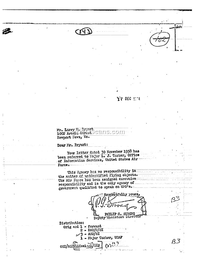 This document is a formal letter dated December 17, 1958, from Philip G. Strong, Deputy Assistant Director of the OSI, to Mr. Larry W. Bryant of Newport News, Virginia. The letter serves as a response to an inquiry Mr. Bryant submitted on November 30, 1958. In the response, Mr. Strong informs Mr. Bryant that his letter has been referred to Major L. J. Tacker of the Office of Information Services, United States Air Force. The document explicitly states that the OSI has no responsibility regarding the subject of unidentified flying objects. Furthermore, it asserts that the United States Air Force holds executive responsibility for this matter and is the sole government agency qualified to provide information or speak on the subject of UFOs.