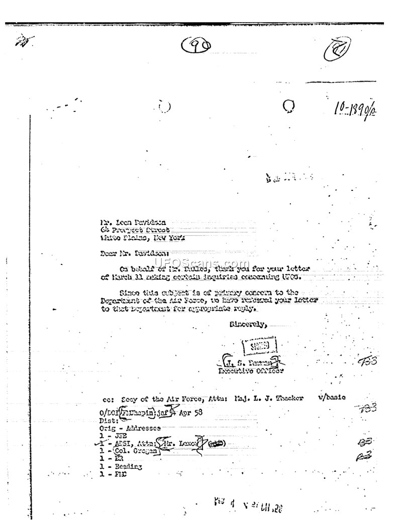 A 1958 letter from an Executive Officer to Leon Davidson, acknowledging his inquiry about UFOs and stating that the matter has been referred to the Department of the Air Force.
