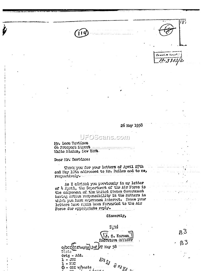 This document is a formal letter dated May 26, 1958, addressed to Mr. Leon Davidson of White Plains, New York. The letter, signed by J. S. Earman, Executive Officer, acknowledges receipt of Mr. Davidson's previous letters dated April 27th and May 10th, which had been addressed to Mr. Dulles and the author. The author clarifies that the Department of the Air Force is the specific component of the United States Government responsible for handling the matters in which Mr. Davidson expressed interest. Consequently, the author informs Mr. Davidson that his letters have been forwarded to the Air Force to provide an appropriate reply.