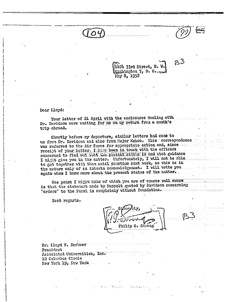 This document is a letter dated May 8, 1958, written by Philip G. Strong to Dr. Lloyd V. Berkner, President of Associated Universities, Inc. The letter serves as an interim acknowledgement of correspondence received from Dr. Berkner on April 21, which included enclosures regarding Dr. Davidson. Strong explains that he had been away on a month-long trip and that similar letters from Dr. Davidson and Major Kehoe had been referred to the Air Force for appropriate action. Strong notes that he has been in contact with the relevant officers to determine the status of the matter and the appropriate guidance to provide, but he will not be able to discuss it further until the following week. Additionally, Strong addresses a specific point regarding a statement made by Ruppelt and quoted by Davidson, asserting that the claim concerning 'orders' to the Panel is entirely without foundation.