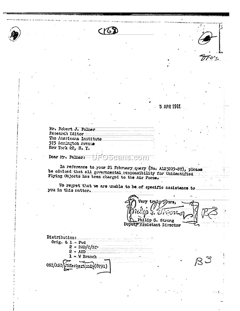 This document is a formal letter dated April 5, 1961, addressed to Mr. Robert J. Palmer, a Research Editor at The Americana Institute in New York. The letter serves as a response to an inquiry submitted by Mr. Palmer on February 21, 1961, referenced as No. A123209-3T. In the correspondence, Philip G. Strong, the Deputy Assistant Director, informs Mr. Palmer that the agency is unable to provide specific assistance regarding his query. Furthermore, the letter explicitly states that all governmental responsibility for Unidentified Flying Objects has been officially charged to the Air Force. The document includes a distribution list indicating copies were forwarded to various internal departments, including DAD/C/SI, ASD, and W Branch.