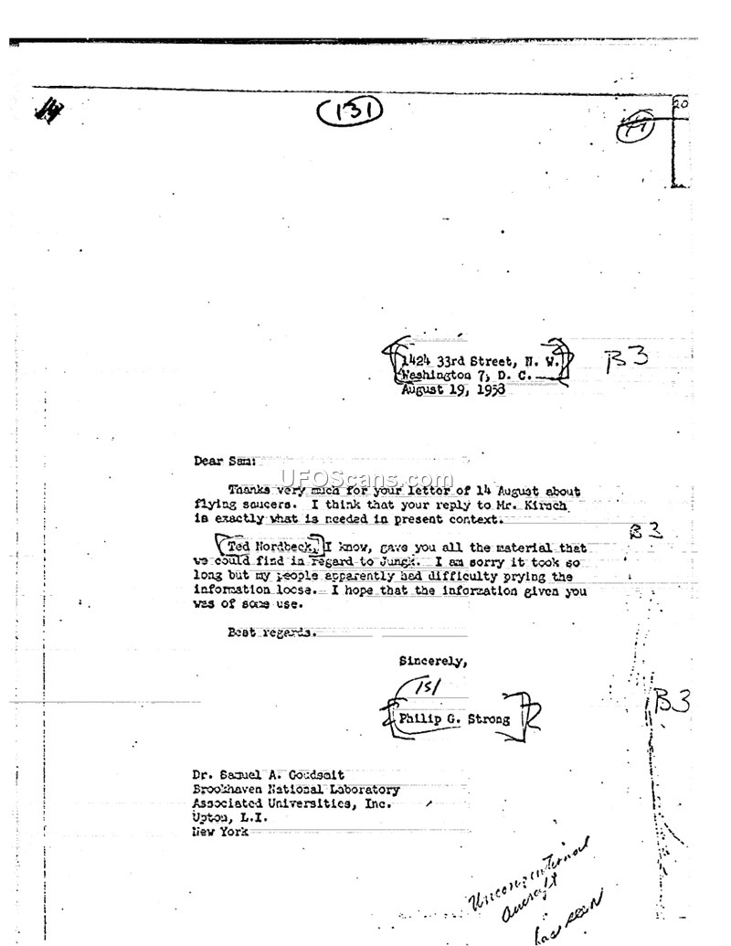 A 1953 letter from Philip G. Strong to Dr. Samuel A. Goudsmit discussing the provision of information regarding flying saucers and a reference to Ted Nordbeck's assistance.
