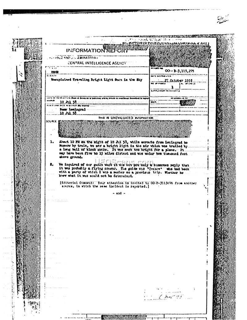 This Central Intelligence Agency information report details an observation made on the night of July 10, 1958. The witness, while traveling by train from Leningrad to Moscow, observed a bright light in the sky. The object was described as being accompanied by a long tail of black smoke. The witness estimated the object to be between five and fifteen miles distant and at an altitude of less than two thousand feet above the ground. The witness noted that the light was too bright to be a plane. Upon inquiring with their guide, a man identified as Ivanov who had accompanied the party on a previous trip, the witness was told that the object was likely a 'flying saucer.' The guide was unable to provide a definitive identification of the object. An editorial comment included in the report notes that this incident is also referenced in another source, document 00-B-3113696.