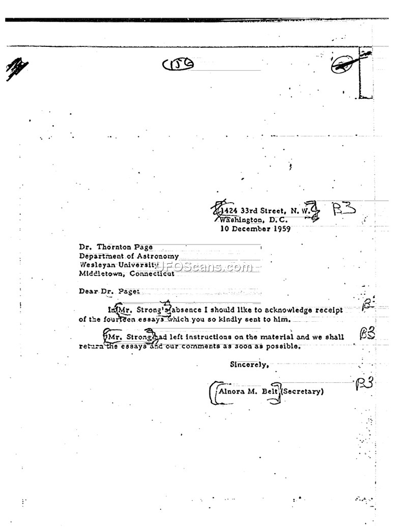 This document is a formal letter dated December 10, 1959, sent from an office located at 1424 33rd Street, N.W., Washington, D.C. The letter is addressed to Dr. Thornton Page at the Department of Astronomy, Wesleyan University, Middletown, Connecticut. The author of the letter is Alnora M. Belt, who identifies herself as a secretary. The purpose of the correspondence is to acknowledge the receipt of fourteen essays that Dr. Page had previously sent to a Mr. Strong. The letter notes that Mr. Strong is currently absent, but that he had left instructions regarding the material. The author assures Dr. Page that they will return the essays along with their comments as soon as possible.