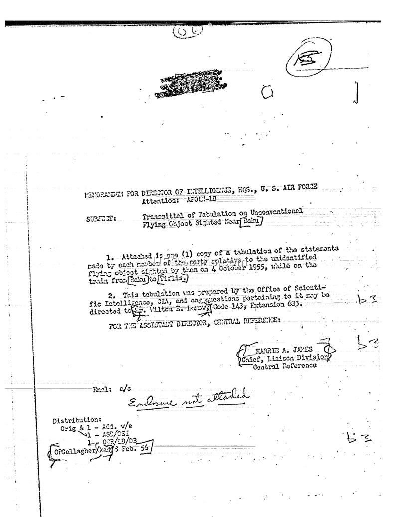 Transmittal of Tabulation on Unconventional Flying Object Sighted Near Baku