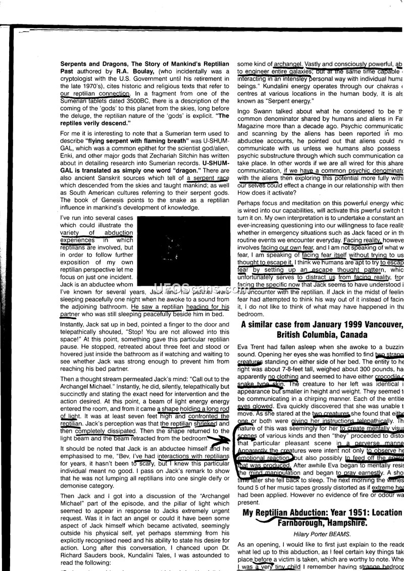 This document serves as a compilation of anecdotal reports and historical interpretations regarding the existence and interaction of reptilian entities with humanity. Authored by R.A. Boulay, the text begins by referencing Sumerian tablets and the concept of 'flying serpent with flaming breath' to establish a historical context for reptilian figures. The author transitions into modern abduction accounts, detailing the experiences of individuals such as 'Jack' and Eva Trent, who describe encounters with reptilian beings in their homes. These accounts often involve themes of paralysis, telepathic communication, and the presence of entities in bedrooms. A significant portion of the document is dedicated to the personal testimony of Hilary Porter Beams, who recounts a 1951 incident in Farnborough, Hampshire, where she witnessed a white glowing disc and a five-foot-tall scaly, reptilian creature. The document also touches upon the alleged 1955 alien diplomacy mission of President Eisenhower at Moultrie/Spence Air Base, referencing a passenger manifest that included various staff members and the television personality Arthur Godfrey. The text concludes by linking these disparate accounts—ranging from ancient mythology to 20th-century military and civilian sightings—under the premise of a persistent, albeit controversial, phenomenon of reptilian-human contact.
